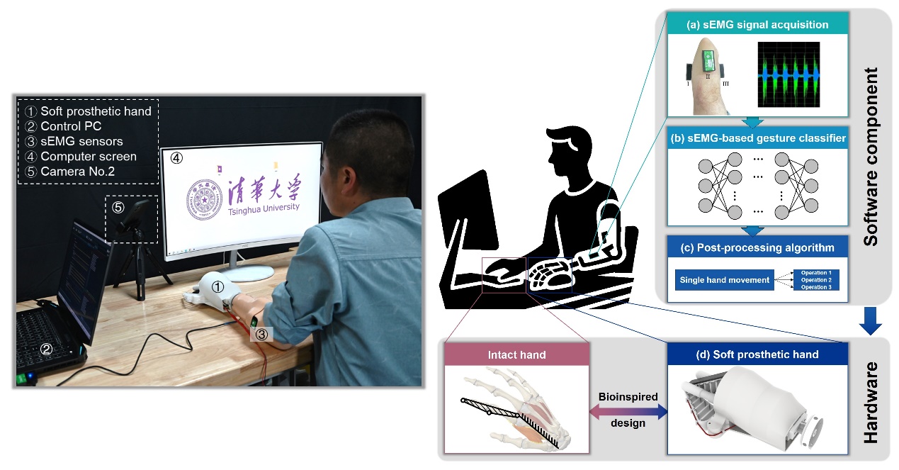 清华新闻网3月28日电 截肢者在与标准计算机外设(如鼠标、键盘)交互时存在操作困难的问题,显著影响其工作机会和生活质量。近日,beat365英国官方网站机械系李曙光课题组与合作者共同研发了一种新型软体肌电假肢手,旨在改善截肢者与计算机的交互体验。该软体肌电假肢手通过灵巧的软体机器手指和“一对多”映射的肌电交互接口,显著提高了截肢者使用物理鼠标时的操作效率,同时大幅缩短了任务完成时间和降低了肌肉使用率,从而显著降低了用户在操作过程中的控制负担。研究为提升截肢者与计算机的交互能力提供了重要的理论和工程依据,展示了软体机器人假肢技术在未来的广阔应用前景。