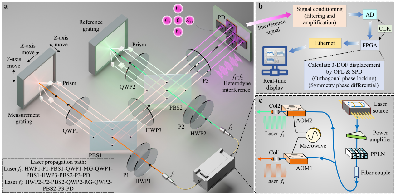 相关研究成果以“多维原子级测量:零死区集成式外差光栅干涉仪”(Towards multi-dimensional atomic-level measurement: integrated heterodyne grating interferometer with zero dead-zone)为题,于6月4日发表于《光:先进制造》(Light: Advanced Manufacturing)。