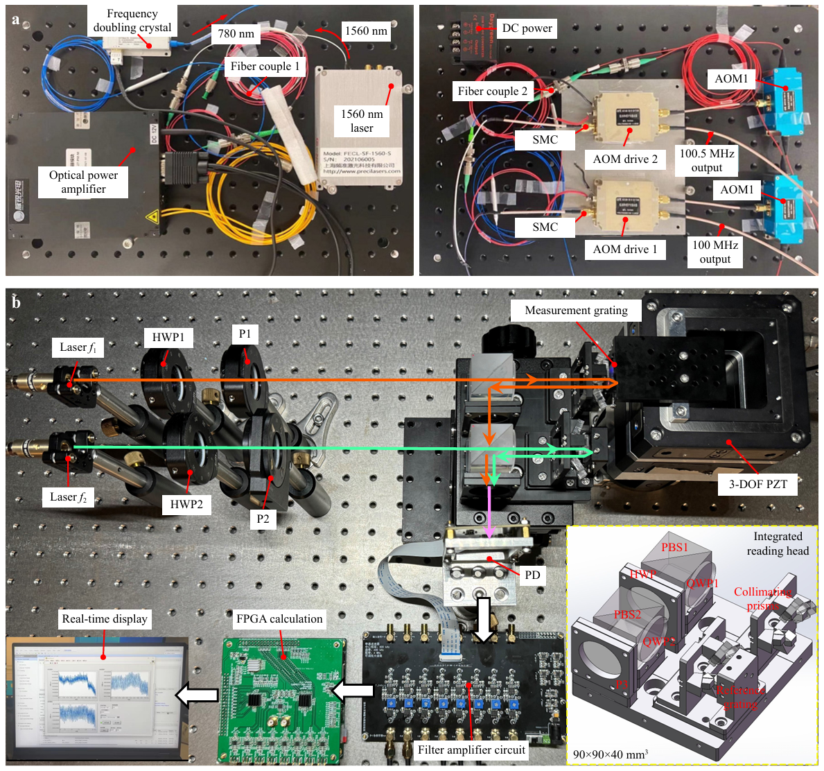 李星辉团队提出并验证了一种集成化零死区外差光栅干涉系统,采用空间对称双光路架构,实现频率与偏振混叠误差的根源性消除,并构建了基于小波分析与巴特沃斯滤波器的误差校正算法,将串扰误差控制至5%以下。该系统采用紧凑式设计,整体尺寸为90×90×40mm³,结合3自由度纳米压电平台,实现了高精度实时多维位移测量。