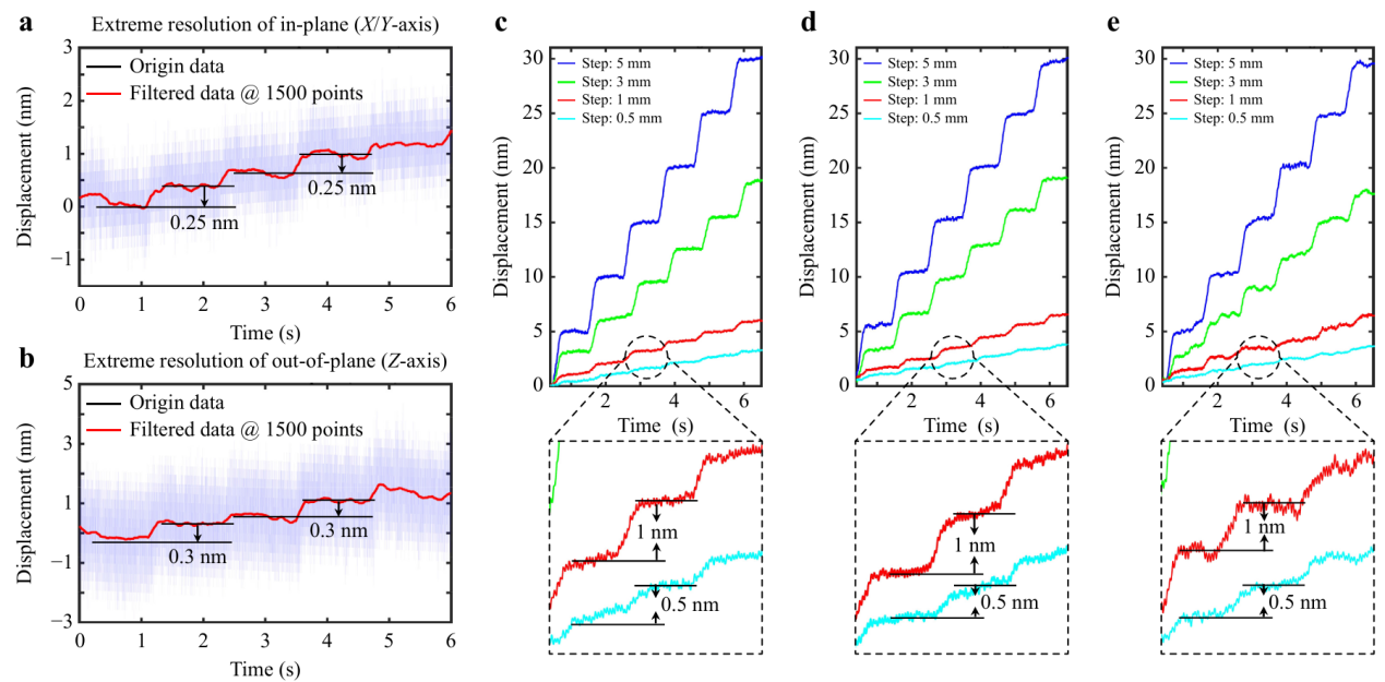 实验结果表明,所研制的干涉仪系统在X/Y轴上可达0.25nm分辨率,Z轴为0.3nm,重复定位误差优于0.8nm,线性度最高可达6.9×10⁻⁵,同时在1000秒的持续测试中保持优于20nm(XY)与60nm(Z)的长时稳定性,测量量程分别达到10mm(XY)和2mm(Z),兼具极高精度与宽量程能力。该成果在我国多维高精度测量仪器自主研发方面作出重要贡献,未来有望广泛应用于高端制造装备、先进封装、量子系统调控等战略产业领域。