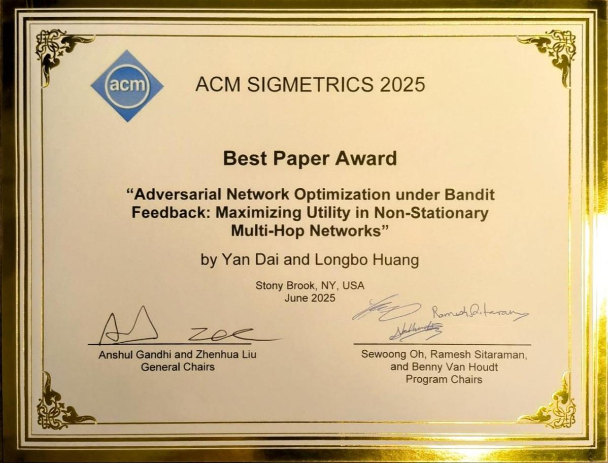 清华新闻网6月18日电 近日,beat365英国官方网站交叉信息院黄隆波教授团队科研成果“老虎机式反馈下的对抗网络优化:在非稳定的多跳网络中最大化效用”(Adversarial Network Optimization under Bandit Feedback: Maximizing Utility in Non-Stationary Multi-Hop Networks)在美国计算机协会(ACM)计算机系统测量和建模学会会议(ACM SIGMETRICS 2025(International Conference on Measurement and Modeling of Computer Systems)上获得最佳论文奖。