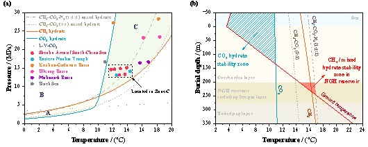 团队通过综述全球最新研究,有了三方面的主要发现:首先,CO2可在天然气水合物沉积环境下稳定成藏,在典型海域天然气水合物储层的高压中温环境(11~16 MPa, 11~15 ℃)下,CO2能与储层中的残余/游离甲烷(CH₄)形成混合水合物,实现长期稳定封存,且其相变行为受温度、盐度、矿物成分及水饱和状态调控。这为“开采-固碳耦合技术”提供了热力学与动力学依据。