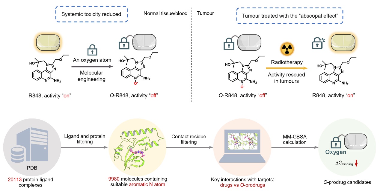 刘志博课题组面向临床联合放化疗减毒增效的需求,致力于开发放疗响应药物技术。本次研究的第一项发现起源于刘志博课题组2022年发展的新化学:活体内放疗驱动的氮氧化物(N-oxide)脱氧反应。作者通过计算机辅助的药物设计分析、筛选含喹啉等基团的药物分子,构建单个氧原子工程化的放疗响应前药分子(SAE-RAP),利用氧原子对药物活性基团“上锁”,此后在肿瘤内通过放疗照射“解锁”恢复药物活性。通过“系统给药+局部激活”的新颖方式,TLR7/8激动剂被精确激活于肿瘤局部,避免了全身毒性的发生,有望突破以往免疫激动剂使用中的“疗效-毒性”矛盾。此外,SAE-RAP平台技术后续可针对多种靶点开发高原子经济性的放疗响应药物,为临床放射联合化疗/免疫治疗提供降毒增效的新对策。