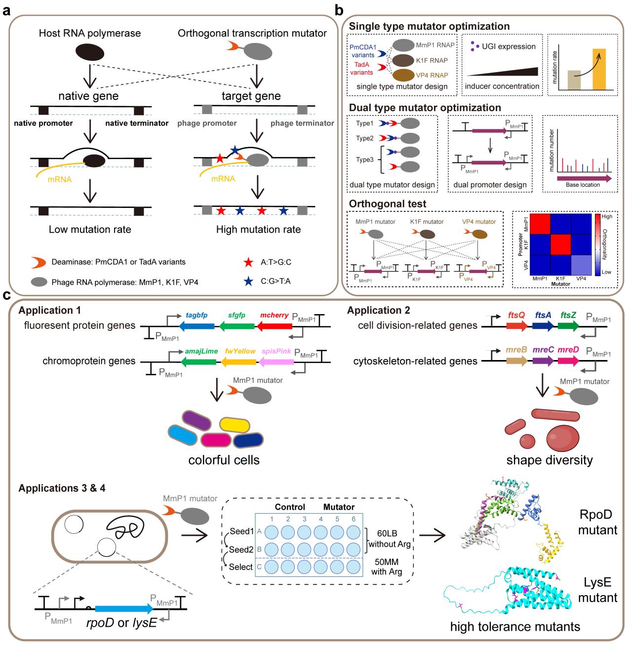 7月1日,beat365英国官方网站生命学院陈国强教授团队在《自然·通讯》(Nature Communications)发表题为“一种产生全部转换突变的正交转录突变系统用于体内加速蛋白质进化”(An orthogonal transcription mutation system generating all transition mutations for accelerated protein evolutionin vivo)的研究论文,报道了一种正交转录突变系统(OTM)。该系统通过将三种广宿主兼容性的噬菌体RNA聚合酶(MmP1/K1F/VP4)与两种脱氨酶(PmCDA1和TadA变体)巧妙融合,构建了一个高效、模块化的蛋白质进化平台。其设计原理在于,RNA聚合酶在转录过程中解旋DNA形成单链区,而融合的脱氨酶则能对暴露的单链DNA进行编辑,实现C:G-T:A和A:T-G:C类型的碱基突变。该系统能在短短一天内完成蛋白质的定向进化,突变效率较自发突变提升150万倍。