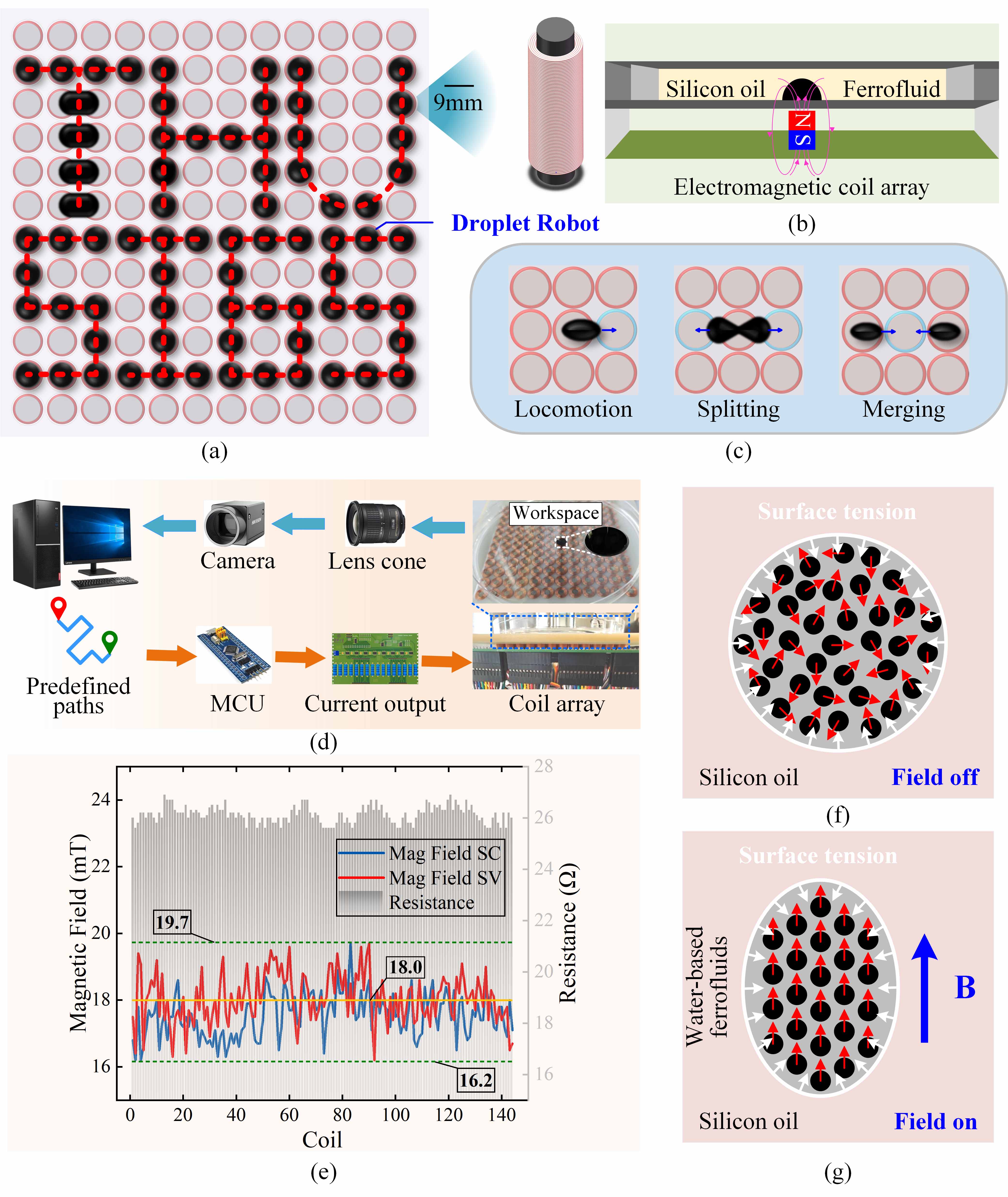 团队首先构建了一种高密度分布式电磁线圈阵列,用于在毫米尺度上实现液滴机器人大规模可编程操控。该平台集成了144个小尺寸电磁线圈,能够在113×113平方毫米的工作空间内生成多个局部磁场,从而实现多点独立驱动。结合有限元仿真,团队分析了单个线圈及其铁芯所产生的复合磁场分布特性,并评估了磁力对液滴的驱动效果。平台融合定制驱动电路、视觉反馈模块与多线程软件架构,实现了对磁场的高精度调控,确保机器人响应的实时性与准确性;低功耗驱动保障了系统长时间的稳定运行。
