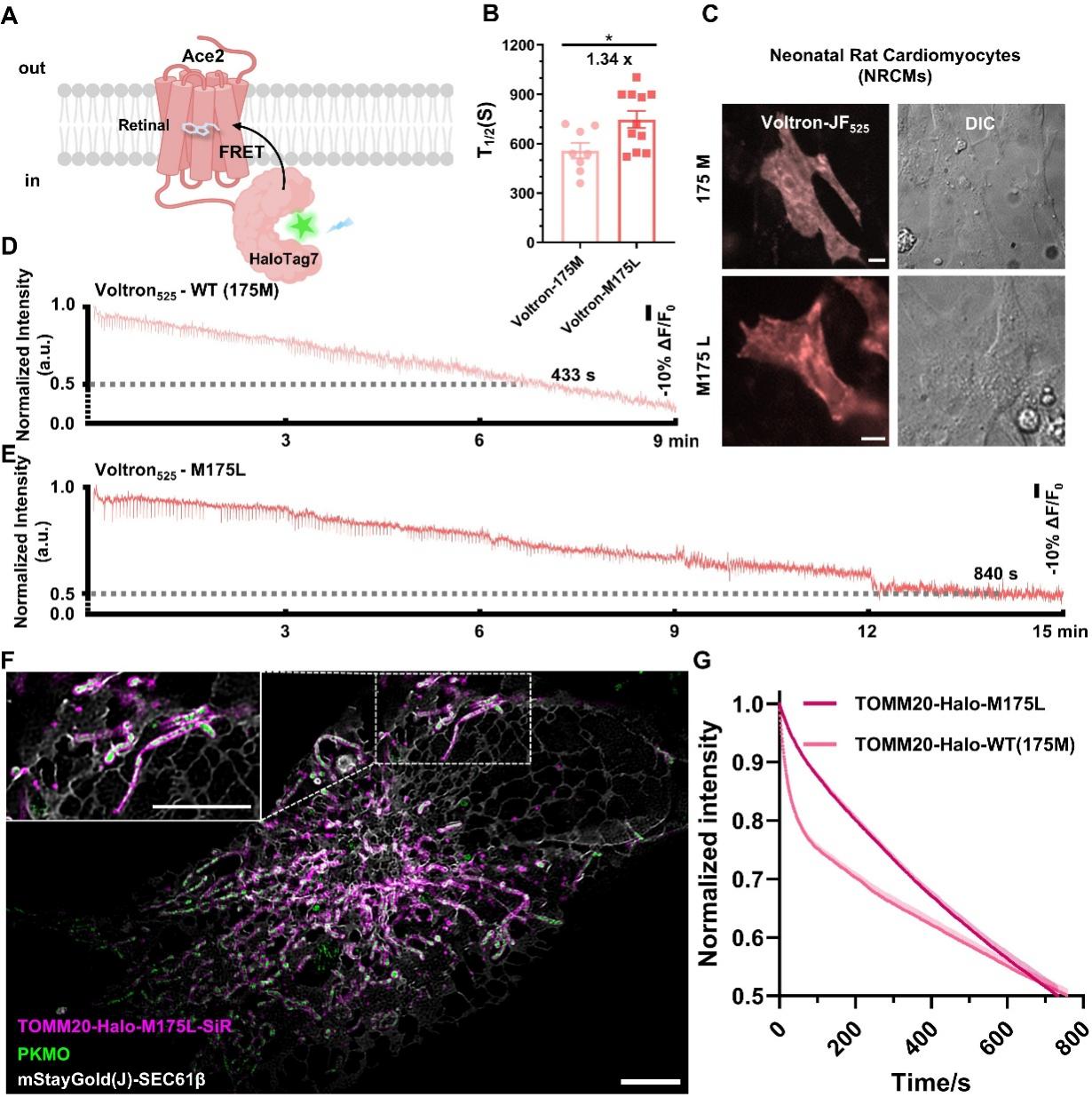 基于这一发现,研究团队进一步提出“硫醚编辑”策略——降低或消除荧光染料附近的“硫醚效应”可以显著提升染料的光稳定性。在验证了HaloTag系统中硫醚对于罗丹明类染料光稳定性的影响后,研究团队筛选出HaloTag: M175L突变体作为对于罗丹明类染料广泛适用的高光稳定性成像平台,并将其应用在了电压成像和结构光照明(SIM)超分辨成像中(图2),显著延长了高质量活细胞荧光成像时间。