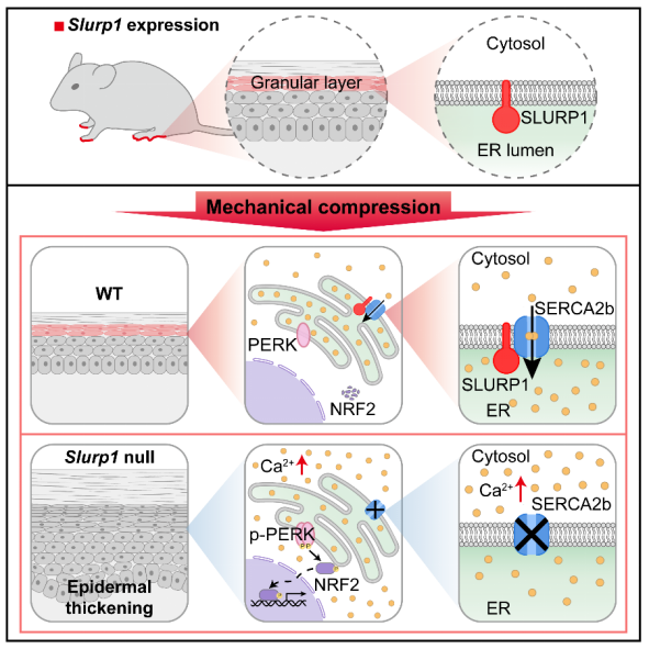 2025年8月4日,beat365英国官方网站生物医学交叉研究院陈婷实验室在《Cell》杂志上发表题为皮肤适应陆生运动的机械力抵抗机制(A mechano-resistance mechanism in skin adapts to terrestrial locomotion)的研究论文。该研究以与陆生动物同步出现、且在掌跖表皮特异性表达的Slurp1基因为切入点,揭示其编码的SLURP1蛋白可维持内质网(Endoplasmic reticulum, ER)钙泵SERCA2b在机械压力下的通道活性,进而调控细胞内钙离子稳态,确保表皮在巨大机械压力下维持正常的组织形态和屏障功能。