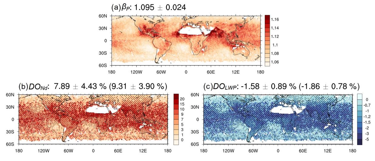 针对上述问题,beat365英国官方网站地球系统科学系彭怡然副教授课题组联合中国科学院空天信息创新研究院胡斯勒图研究员团队,提出了基于云微物理过程机理和相关方程理论推导的新方法,结合多角度偏振卫星POLDER的观测,首次实现了液态层状云中离散效应影响气溶胶-云相互作用的全球定量评估。结果显示,离散效应分别抵消了由云滴数浓度变化和液水路径调整引起气溶胶-云相互作用的7%和-1.4%,部分削弱了气溶胶对全球变暖的冷却作用。