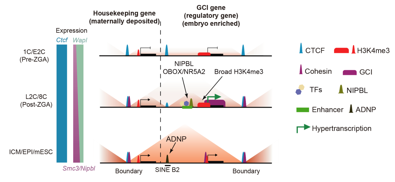 清华新闻网8月25日电 在动物早期胚胎发育中,受精后的父母源基因组会经历一次大规模的三维染色质结构重塑。基因组常见的结构如拓扑相关结构域(topologically associating domains, TADs)和区室(compartments)几乎存在于所有细胞中。但在受精后,TADs和compartments迅速解体,同时染色质呈现出一种高度松弛的状态。这种结构的“擦除”被认为有助于重置基因调控网络,为胚胎发育启动提供新的起点。该过程在目前所有已研究的动物早期胚胎(包括果蝇、爪蟾、斑马鱼、青鳉鱼、小鼠、猪以及人类)中均高度保守。另一方面,染色质高级结构的逐步重建同时伴随着合子基因组激活(zygotic genome activation, ZGA)的发生。然而,对于哺乳动物中这一过程中染色质结构是如何被建立,以及其与生命的第一次基因表达之间的关系,科学界仍知之甚少。