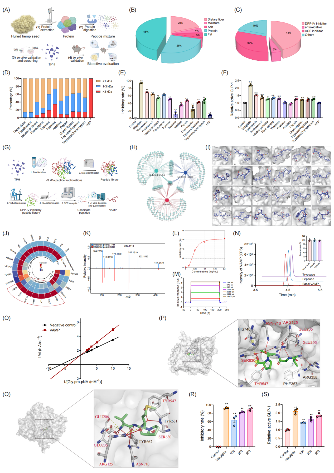 综上,研究建立的整合筛选方法为生物活性肽挖掘提供了新范式。新发现的火麻仁来源四肽VAMP通过抑制DPP-IV活性和特异性促进阿克曼氏菌增殖的双重机制改善糖代谢,为开发基于天然活性肽的降糖干预策略提供了理论依据和可靠方法。