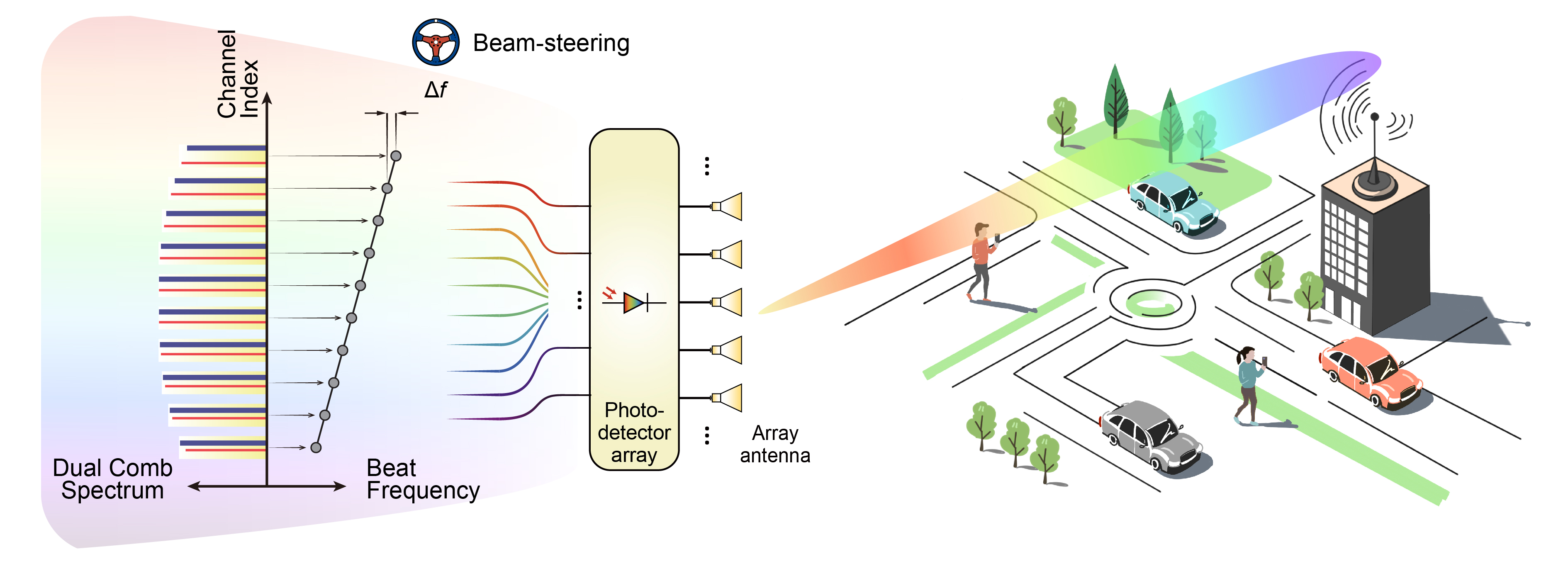图1.基于双光频梳驱动的等效真延时相控阵概念图
