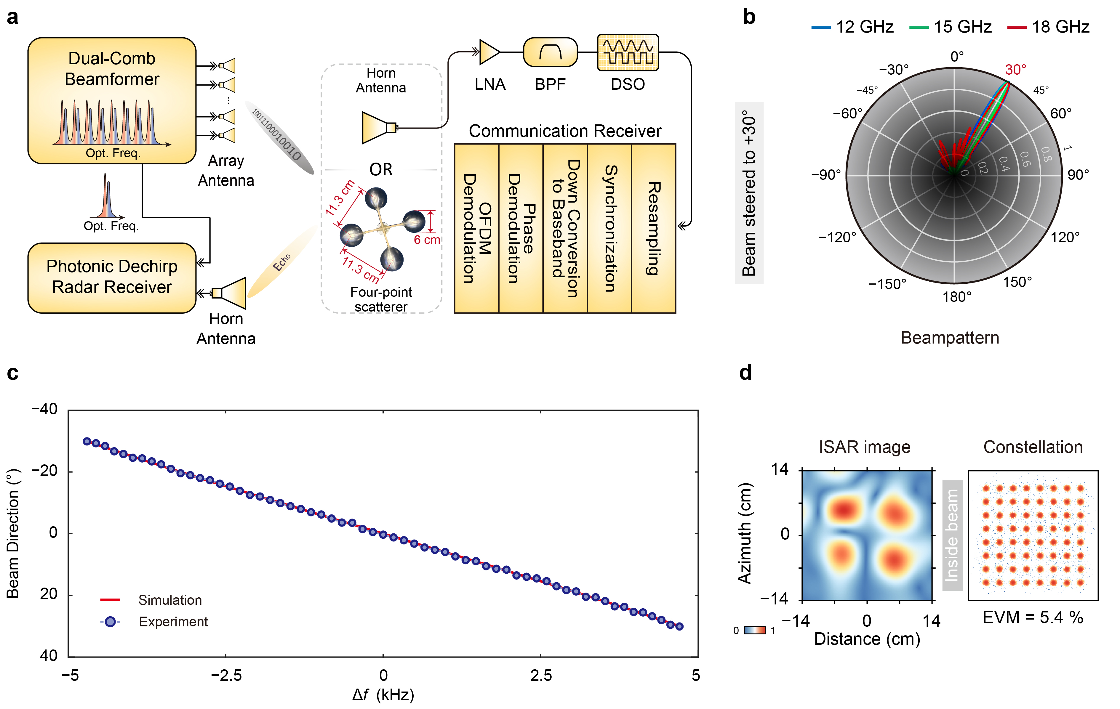 团队分别构建了1×16、4×4的一维和二维相控阵实验系统,在Ku波段成功验证了其超宽带、无倾斜波束赋形与连续波束扫描能力,瞬时带宽覆盖整个Ku波段(12-18GHz)。团队进一步将所提出的系统应用于通信感知一体化(Integrated sensing and technology,ISAC)场景(图2),采用以线性调频信号为载波的正交频分复用相位调制作为ISAC波形,成功实现了高分辨逆合成孔径雷达成像与高速通信功能。雷达二维成像分辨率达到2.6×3.0cm,通信速率达到4.8Gbps。该研究展示了光频梳驱动的超宽带相控阵系统在结构紧凑性、高可扩展性与灵活波束调控方面的优势,为未来高性能ISAC硬件平台的发展提供了一种极具竞争力的解决方案。