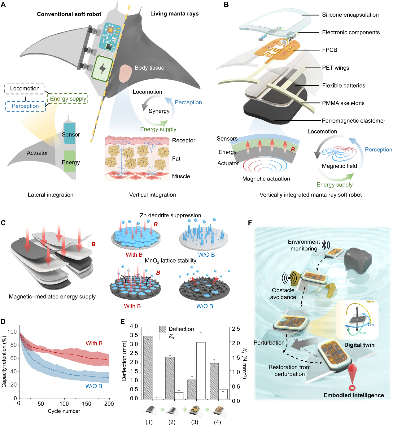 清华新闻网9月17日电 软体动物如章鱼、水母和鳐鱼,能够通过在组织内部无缝集成运动、感知与能量供给系统,实现对复杂环境的适应性运动,这种天然架构体现了生物的具身智能。相比之下,传统软体机器人多依赖传感、驱动和能量模块的横向拼接,但受限于结构空间与固有变形,其在集成高能量密度电源方面存在困难,限制了持续运行和动态适应能力。尤其是柔性电池在变形和振动下电化学过程易受干扰,导致容量衰减与短路风险,同时模量不匹配也削弱了机器人运动性能。为此,亟需发展垂直集成方法,在保持机器人柔顺性的同时最大化功能区域利用,实现驱动、感知与供能系统的高效协同,从而推动软体机器人迈向真正的具身智能。