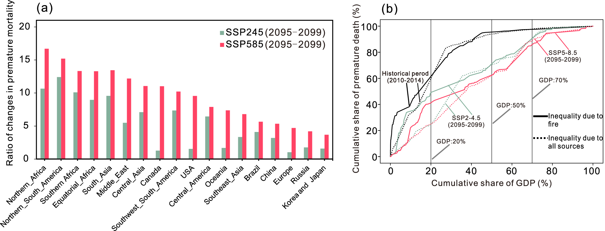图2.不同地区野火PM2.5健康效应及其全球分布格局(历史与未来情景对比)
