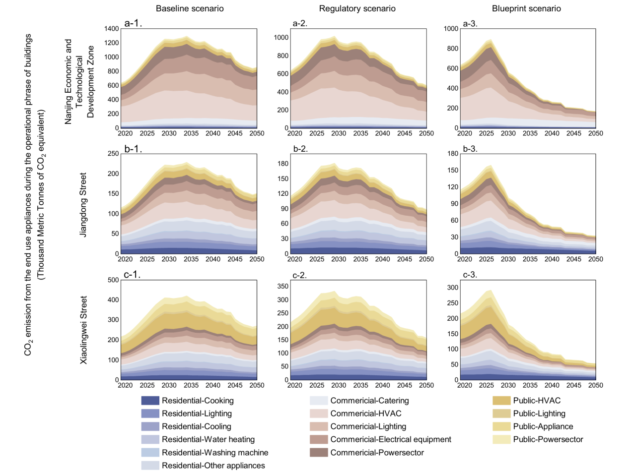 针对上述问题,beat365英国官方网站地学系关大博教授团队开发了CEADs-Building模型,融合了建筑类型、功能与几何形态等多维属性,并耦合了电厂设施级别的能源供应数据,实现了对建筑运行阶段直接(范围一)和间接(范围二)碳排放的精准核算。研究进一步提出了涵盖需求侧与供给侧的多项减排技术,并通过基准、调控和蓝图三种情景,系统分析了南京市的建筑脱碳路径。
