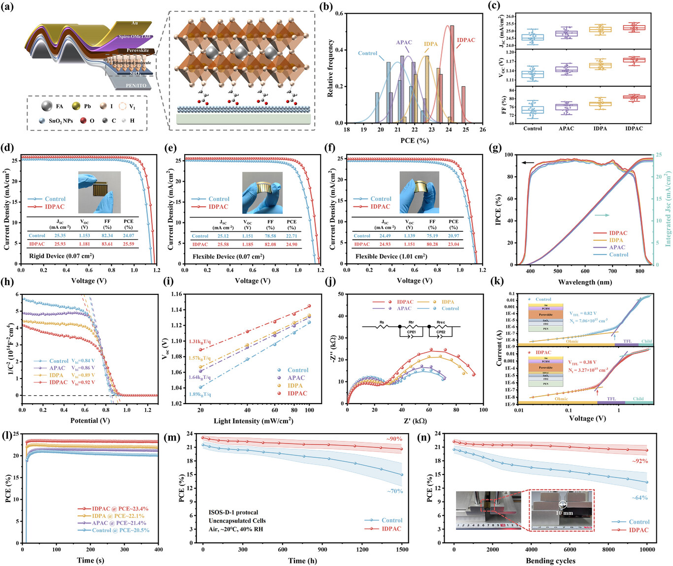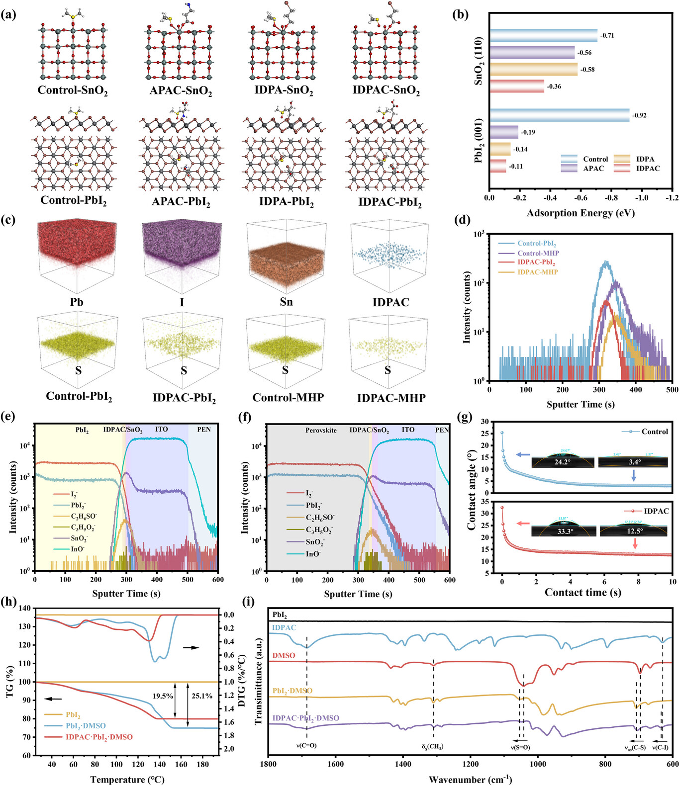理论计算结果显示双官能团分子显著降低了DMSO分子在SnO2和PbI2表面的结合能,有助于DMSO的充分挥发。飞行时间二次离子质谱确定了DMSO在PbI2与钙钛矿薄膜中的空间分布,并论证了DMSO残留量的显著降低。动态接触角,热重分析及红外光谱等综合分析表明IDPAC分子能够通过化学钝化削弱SnO2与PbI2对DMSO的吸附作用,从而获得埋底界面孔洞消除、残余应力应变松弛的高质量柔性钙钛矿薄膜。