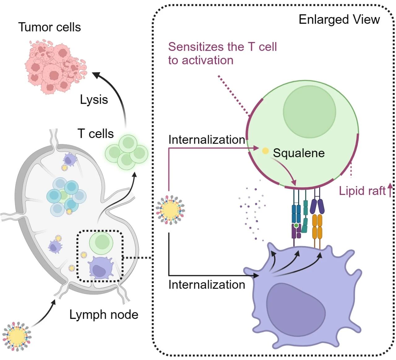 这一研究报道了一种诱导强效抗原特异性T细胞应答的固体自乳化纳米疫苗;阐明了该疫苗依赖表面吸附的蛋白冠组分ApoE提高淋巴结蓄积,同时通过对DC和T细胞的双向调控并产生强大的抗肿瘤T细胞应答和抗肿瘤效果,为未来肿瘤疫苗的研究提供新的思路。