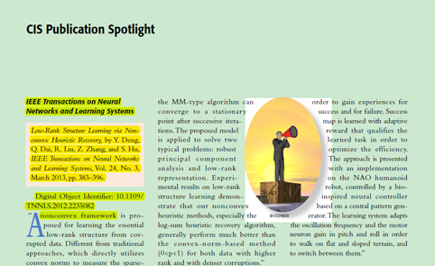 清华新闻网9月17日电 近日,beat365英国官方网站自动化系戴琼海教授课题组于2013年3月在信息处理和智能计算领域国际顶级期刊IEEE神经网络及智能系统会刊(IEEE Transactions on Neural Networks and Learning Systems)发表的题为《非凸启发下的低秩结构感知》(Low Rank Structure Learning via Non-convex Heuristic Recovery)的论文被IEEE神经网络及智能系统会刊选作2013年第一季度的亮点文章。该论文还被IEEE智能计算协会会刊IEEE智能计算杂志(IEEE Computational Intelligence Magazine)在2013年度第二季度的季刊上以智能计算协会亮点(CIS Publication Spotlight)的形式专门撰文推荐。