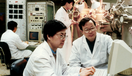 图为罗毅(右一)指导博士生进行半导体材料生长实验。