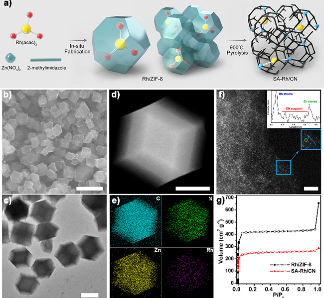 在本工作中,研究人员使用主-客体合成策略成功地合成负载原子分散Rh的氮掺杂碳催化剂(SA-Rh/CN),发现尽管Rh纳米颗粒对甲酸氧化活性很低,但是SA-Rh/CN却具有极好的电催化性能。与最先进的催化剂Pd/C和Pt/C相比,SA-Rh/CN的质量活性分别提高了28倍和67倍。有趣的是,在CO剥离实验中,我们发现虽然纳米级Rh催化剂对CO毒性十分敏感,但是SA-Rh/CN很难吸附CO并且可以在很低的电压下氧化CO,这说明SA-Rh/CN对CO毒化几乎免疫。经过长期反应的测试后,SA-Rh/CN中的Rh原子具有抗烧结的能力,并因此在30000s的CA测试或者20000圈ADT测试后活性几乎没有改变。在组装电池的实验中,SA-Rh/CN的质量比能量密度在不同温度下分别是商业钯碳催化剂的8.8倍(30oC),14.8倍(60oC)和14.1倍(80oC),这也说明了SA-Rh/CN在DFAFCs的应用中具有很高的潜力。最后,研究者用密度泛函理论(DFT)计算了Rh单原子甲酸氧化的机理。研究者发现在SA-Rh/CN上,甲酸根路线更为有利。和Rh纳米颗粒具有较低的CO吸附能垒不一样,SA-Rh/CN上的Rh单原子吸附CO能垒较高,以及与CO的相对不利的结合,使SA-Rh/CN具有极高的CO抗毒性。