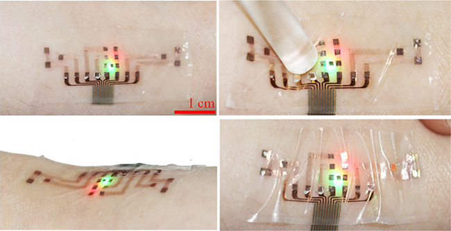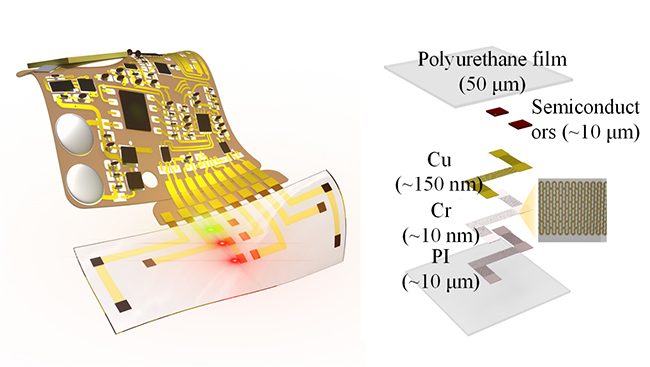 针对上述问题,冯雪教授课题组发展了基于光学原理的血压监测方案,利用生物兼容性材料制备了可以与人体自然共形贴附的光电系统。通过测量血液对不同波长的光波吸收情况,判断血液的容积和流速变化,从而测量出血氧和血压值。