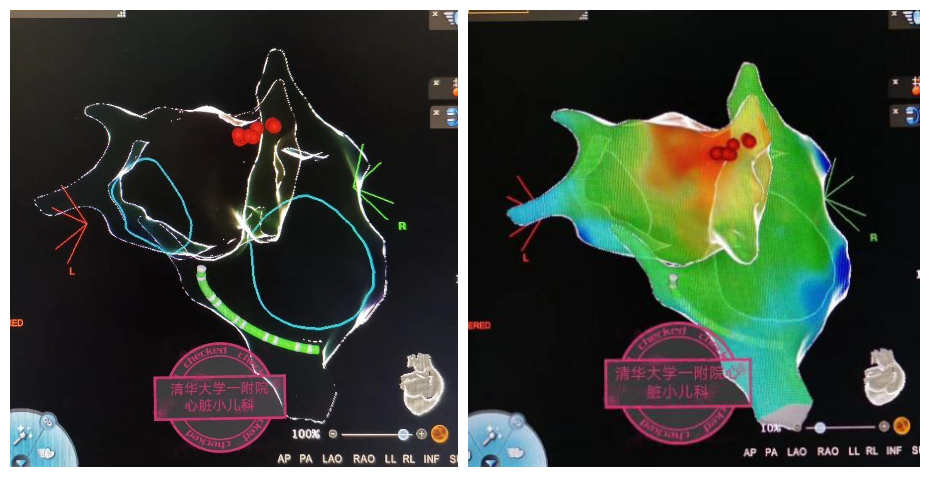 2020年7月,一位来自外地的13岁患儿,有较复杂的房性心动过速,在当地多种用药未能控制心动过速,导致心功能损伤,经当地医生和北京某三甲医院医生的推荐,家长慕名找到李小梅并通过急诊收住院,停服抗心律失常药物并完善术前准备。7月8日,李小梅带领江河副主任医师及儿童电生理团队为患儿实施了射频消融手术。在精确度为1mm的CARTO Version 6磁导航标测系统下,行右心房建模标测后确定病灶来源于相邻左心房,行房间隔穿刺术,进行左心房建模标测,精细刻画左心房模型,与CT三维重建的左心房及肺静脉解剖图像重合,模型精细保真度非常高。同时采点记录左心房每一个位点的电学信息,精准定位房速病灶起源于右肺静脉前庭。随放电消融开始即刻房速终止,转复为正常的窦性心律,继续累积两分钟消融巩固治疗,一次放电获得成功,消除了困扰患儿的房速和笼罩全家的阴霾。