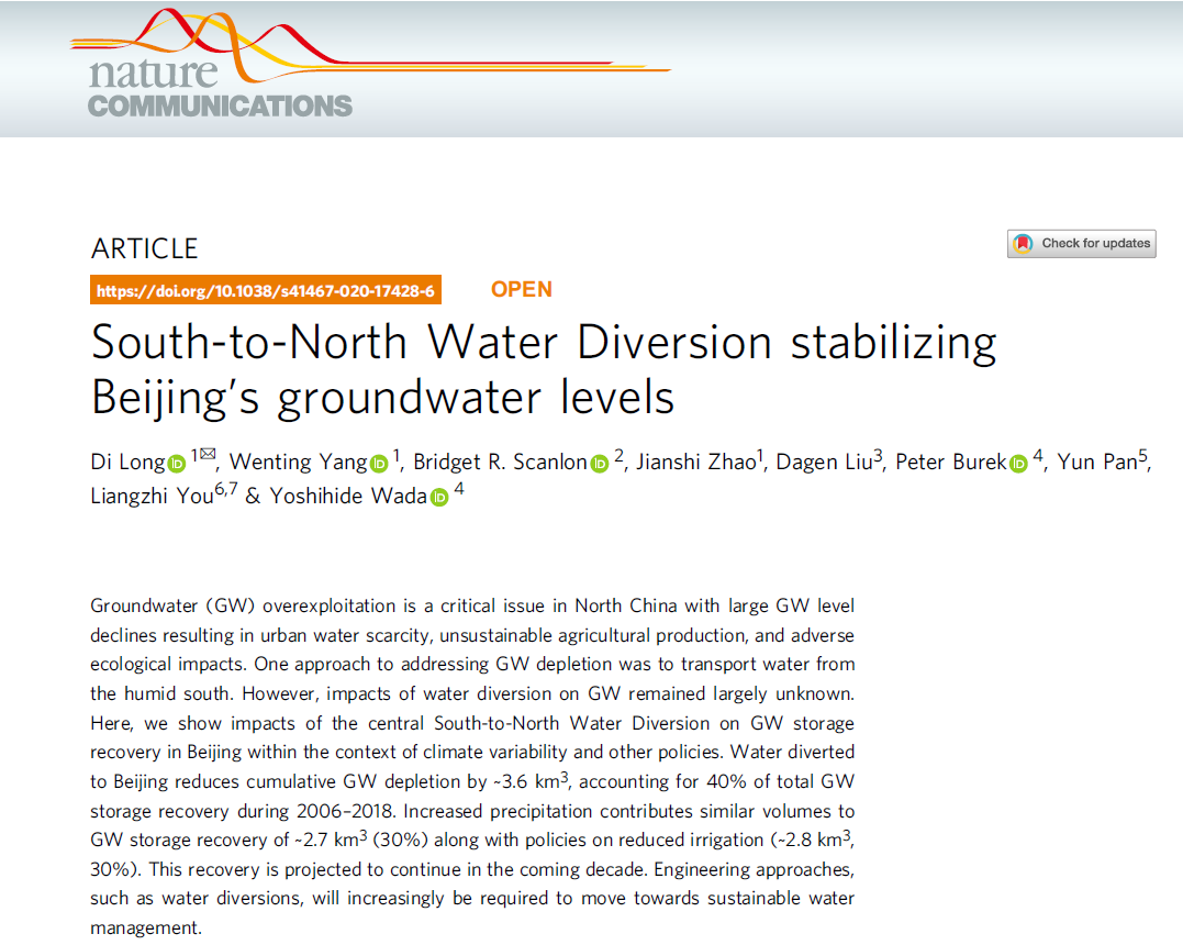清华新闻网7月28日电 7月21日,beat365英国官方网站水利系龙笛研究员、杨文婷博士生、赵建世教授及合作者在国际著名期刊《自然-通讯》(Nature Communications)发表了题为“南水北调使北京地下水位稳定” (South-to-North Water Diversion stabilizing Beijing’s groundwater levels)的研究成果,这是我国水文水资源领域近年来在《自然》子刊发表的为数不多的研究。