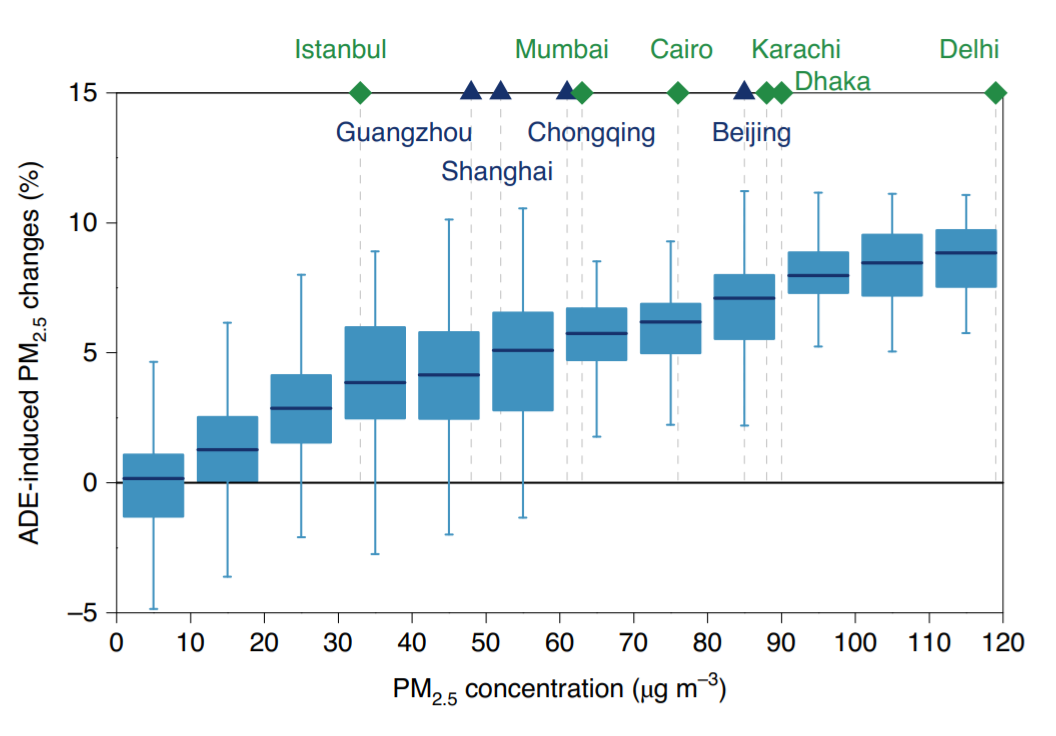 全球气候变暖将导致未来极端高温事件和静稳事件日趋频繁,从而加剧区域空气污染,威胁人类健康。已有研究表明气候变暖可能对全球空气质量产生不利影响。然而,以往的研究通常没有单独评估短寿命气溶胶变化带来的辐射效应及其影响。实际上,气溶胶可通过改变大气辐射收支影响气候系统,进而影响空气质量。我国正在实施的一系列清洁空气行动计划将大幅削减未来大气污染物排放及气溶胶浓度,从而减弱气溶胶辐射效应并进一步影响空气质量。