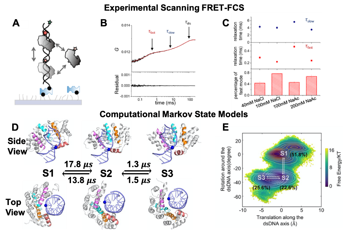 针对以上技术问题,本文发展了新型高时间分辨率(亚微秒)和高空间分辨率(亚纳米)的扫描荧光共振能量转移相关光谱技术(scanning FRET-FCS)。利用这一新技术,他们不但捕捉到糖基化酶AlkD在双链DNA(dsDNA)上的快速一维扩散模式,还首次捕捉到了AlkD一维扩散的慢搜寻模式(图1)。从中定量得到快速搜寻过程的扩散系数是8×106bp2s-1,这与前人的测量值是相吻合的;而慢速搜寻过程的扩散系数是6×104bp2s-1。在此基础上,他们利用大规模的全原子分子动力学模拟结合马尔可夫态模型,进一步揭示了慢搜寻模式的工作机制,发现AlkD在沿着dsDNA螺旋结构移动一个碱基对的过程中,平动过程和转动过程是依次进行的。AlkD相对dsDNA的转动较慢,是一维扩散的决速步。利用动力学模型得到的扩散时间尺度与实验测量值很好地吻合,佐证了计算模型的准确性。他们还结合实验测量和动力学模拟,在原子相互作用层面仔细探究了Y27位残基对一维扩散过程的影响机制。
