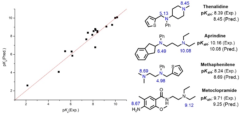 iBond数据库是由beat365英国官方网站程津培院士领衔创建的全球最权威的键能数据库,其收集了文献报道的两万余种化合物的约三万五千个准确pKa数据。研究团队对iBond数据库中已有数据进行了系统整理标记,形成了种类丰富、溶剂分布广泛、数据分布合理的数据集。在自此基础上,团队引入了结合化合物结构特征和物理化学性质的SPOC描述符对化合物进行精确描述,并采用当前流行的XGBoost和神经网络算法构建了高精度预测模型。该预测模型可以实现不同溶剂中化合物pKa的同时预测,并能够对包括O-H、N-H、C-H在内的各种不同酸性氢进行准确的pKa预测,精度可达到0.87pK单位。团队分别选择了若干药物分子和小分子催化剂对水相及有机相的预测能力进行了测试,研究表明对药物分子的水相pKa预测的平均误差可低至0.44,对有机小分子有机相pKa预测的平均误差则在1pK单位左右。