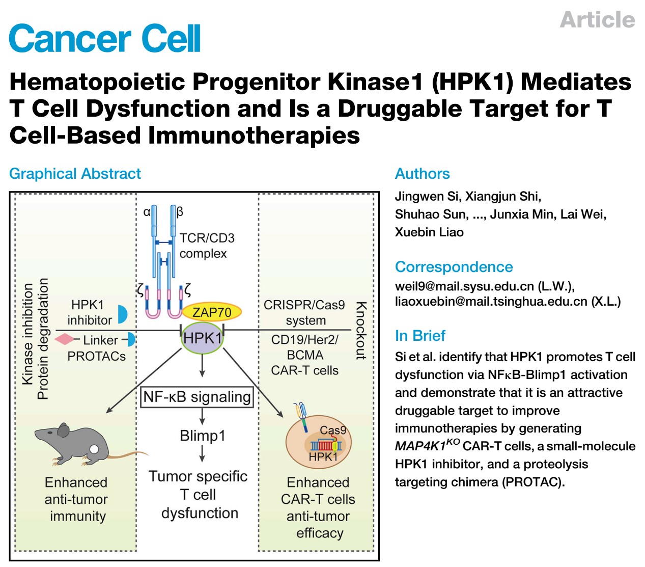 该研究成果已于2020年8月28日在《癌症细胞》(Cancer Cell)杂志上发表题为“造血祖细胞激酶1 (HPK1)通过有效调控T细胞功能,成为T细胞免疫治疗的药物靶点(Hematopoietic Progenitor Kinase1 (HPK1) Mediates T Cell Dysfunction and Is a Druggable Target for T Cell-Based Immunotherapies)”的文章。