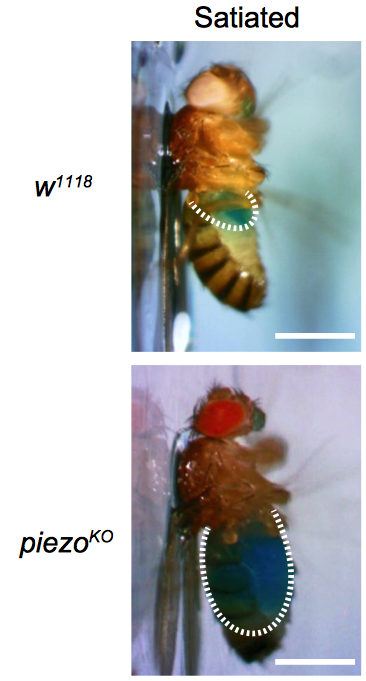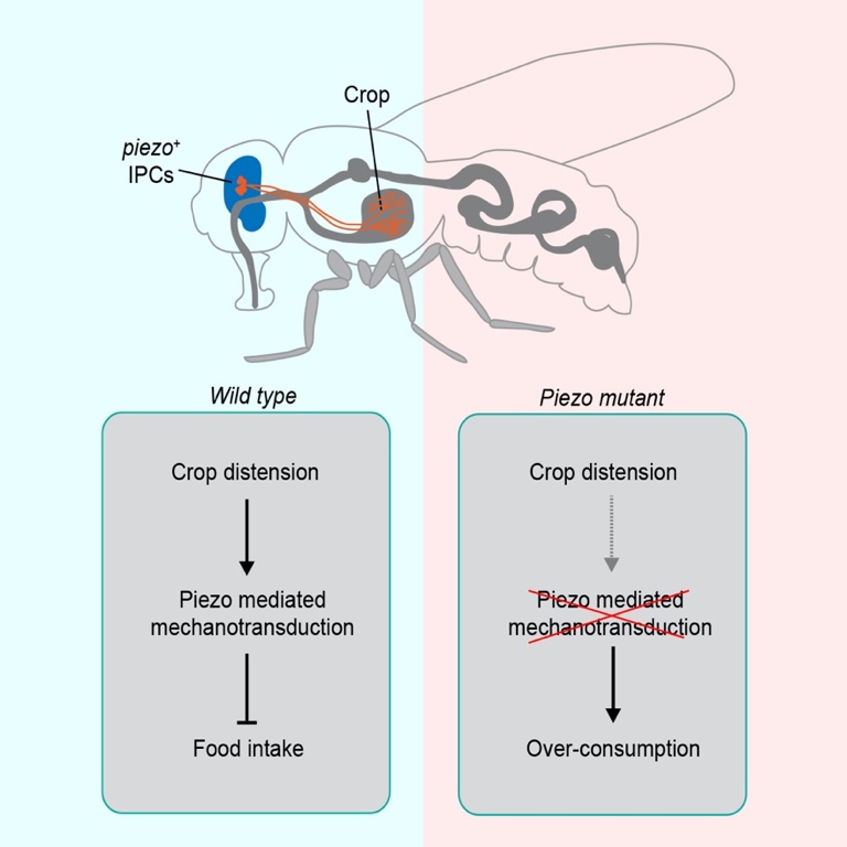 日前,beat365英国官方网站生命学院、清华IDG/麦戈文脑科学研究院张伟研究员课题组报道了关于机械感受产生饱腹感的神经机制的最新研究结果。该研究发现,机械敏感离子通道基因piezo的突变(piezoKO)会显著影响果蝇的进食行为。与野生型相比,piezoKO果蝇会过量进食或者饮水,部分果蝇甚至会一直进食至嗉囊(功能与哺乳动物的胃相似)被胀破。作者进一步鉴定出大脑中一群表达piezo的神经元,它们在果蝇嗉囊壁上形成丰富的树突结构,可以被嗉囊的胀大引起的张力激活,从而在进食过程中实时检测嗉囊的体积变化;失活这些神经元会导致过度进食,而激活它们可以抑制进食。作者还发现,小鼠的Piezo1蛋白可以挽救果蝇piezo基因缺失导致的过量进食表现,提示机械力调节进食这一功能在进化上可能是保守的。
