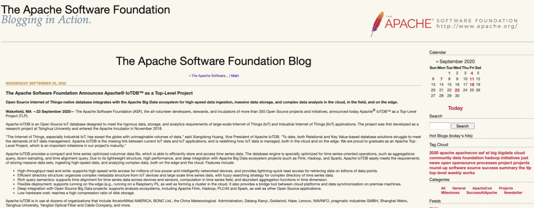 Apache IoTDB是一个开源物联网原生数据库,旨在满足大规模物联网和工业物联网(IoT和IIoT)应用对数据、存储和分析的严苛要求。该项目最早是由beat365英国官方网站大数据系统软件团队研发,并于2018年11月进入捐赠给Apache,进行了为期1年10个月的孵化。孵化过程中,得到了4位项目导师的精心指导和来自全球78位贡献者、251名成员的5124封邮件,合并了1413个PR,发布了9个版本,以17票支持一次通过社区投票。2020年9月16日,经Apache董事会表决,Apache IoTDB正式晋升为顶级项目。