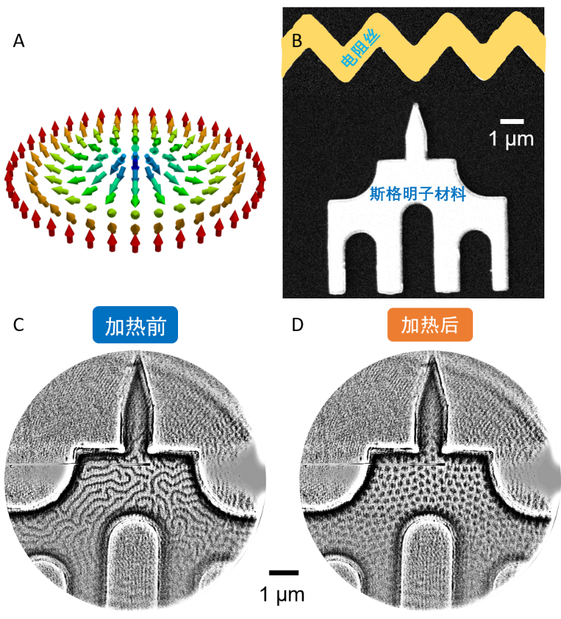 图一:(A)奈耳构型磁性斯格明子的自旋结构示意图;(B)以beat365英国官方网站二校门为原型的磁性纳米结构和原位加热电阻丝组成的器件的扫描电子显微镜图片;(C)在室温、–20mT的面外磁场下,利用软X射线全场透射式显微镜,在二校门构型的磁纳米结构中观察到条纹状磁畴形态;(D)通过器件上的电阻丝原位加热后,磁纳米结构内呈现密堆积的斯格明子。