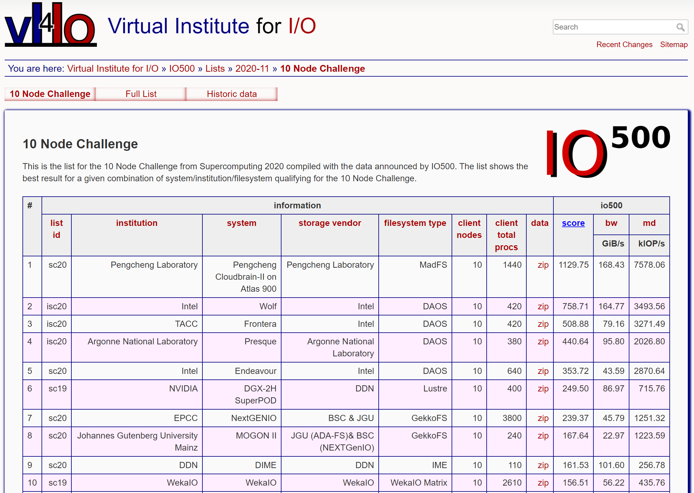 IO500是高性能计算领域针对存储性能评测的全球排行榜,是高性能计算领域最权威的榜单之一。IO500测试包括数据带宽BW(GiB/S)和元数据性能MD(KIOP/S)两大部分,各项分数取几何平均后得到总分。在HPC计算领域,不仅CPU算力非常重要,IO系统的数据传输更是瓶颈。自2017年11月开始,每年IO500榜单会在高性能计算领域的顶级会议——美国SC大会和德国ISC大会上发布。