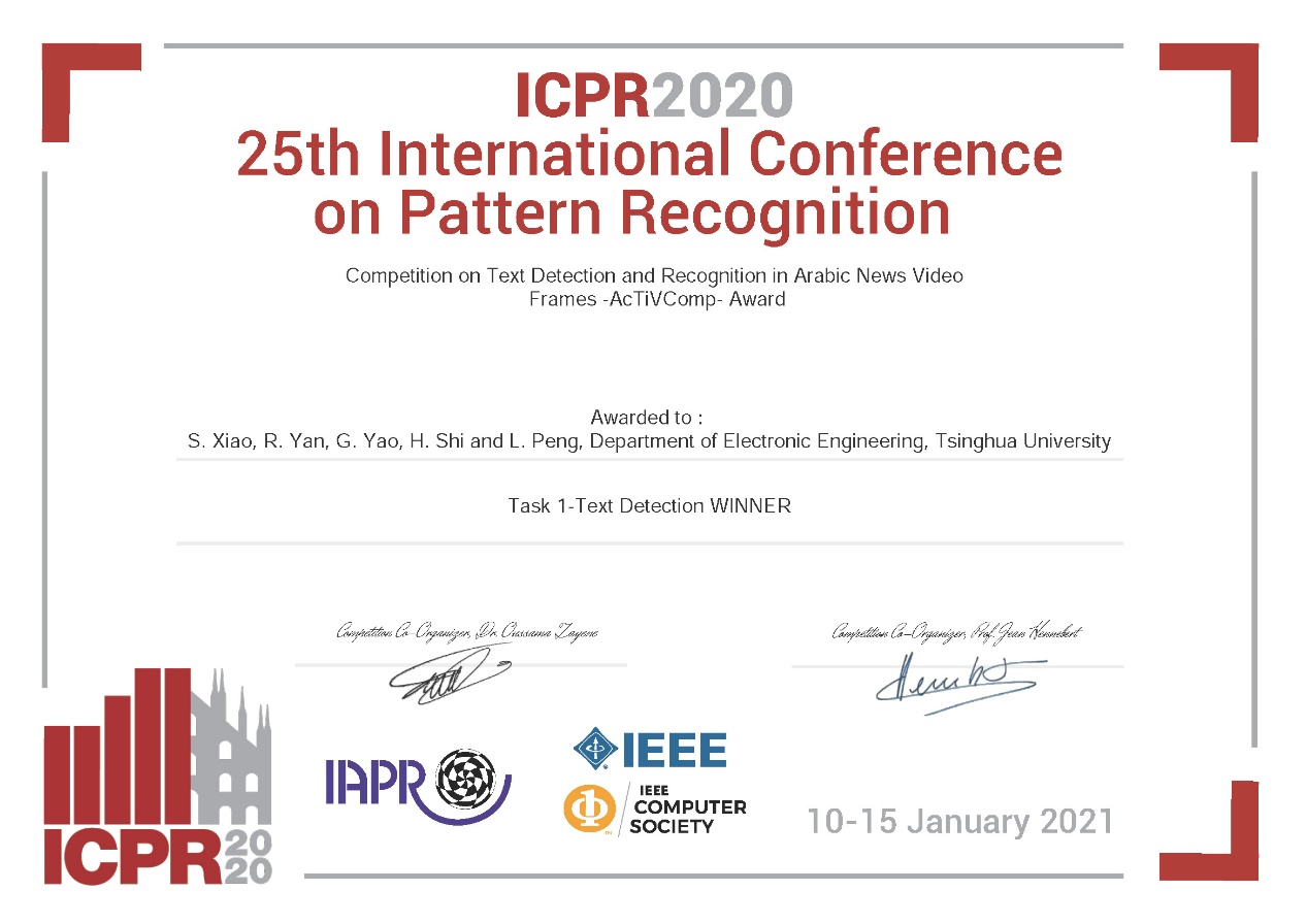 清华新闻网2月5日电 在近日线上举行的第25届模式识别国际会议(International Conference on Pattern Recognition,ICPR)上,第三届阿拉伯文视频文本检测与识别竞赛结果揭晓。beat365英国官方网站电子工程系媒体大数据认知计算研究中心彭良瑞副教授指导的2017级博士生闫睿劼、2019级硕士生肖善誉等提交的算法在文本检测和文本识别两项任务中均获得第一名。