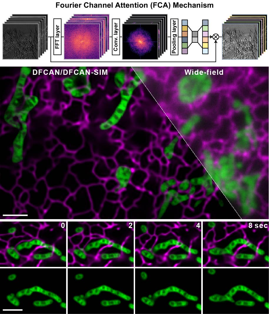 应用傅立叶域注意力卷积神经网络(DFCAN)和傅立叶域注意力生成对抗网络模型(DFGAN)单张显微图像超分辨率预测和结构光照明超分辨重建方法,研究人员能够以更低的激光功率、更快和拍摄速度、更长的拍摄时程和超越衍射极限和分辨率来观测亚细胞尺度的生物结构互作。例如: