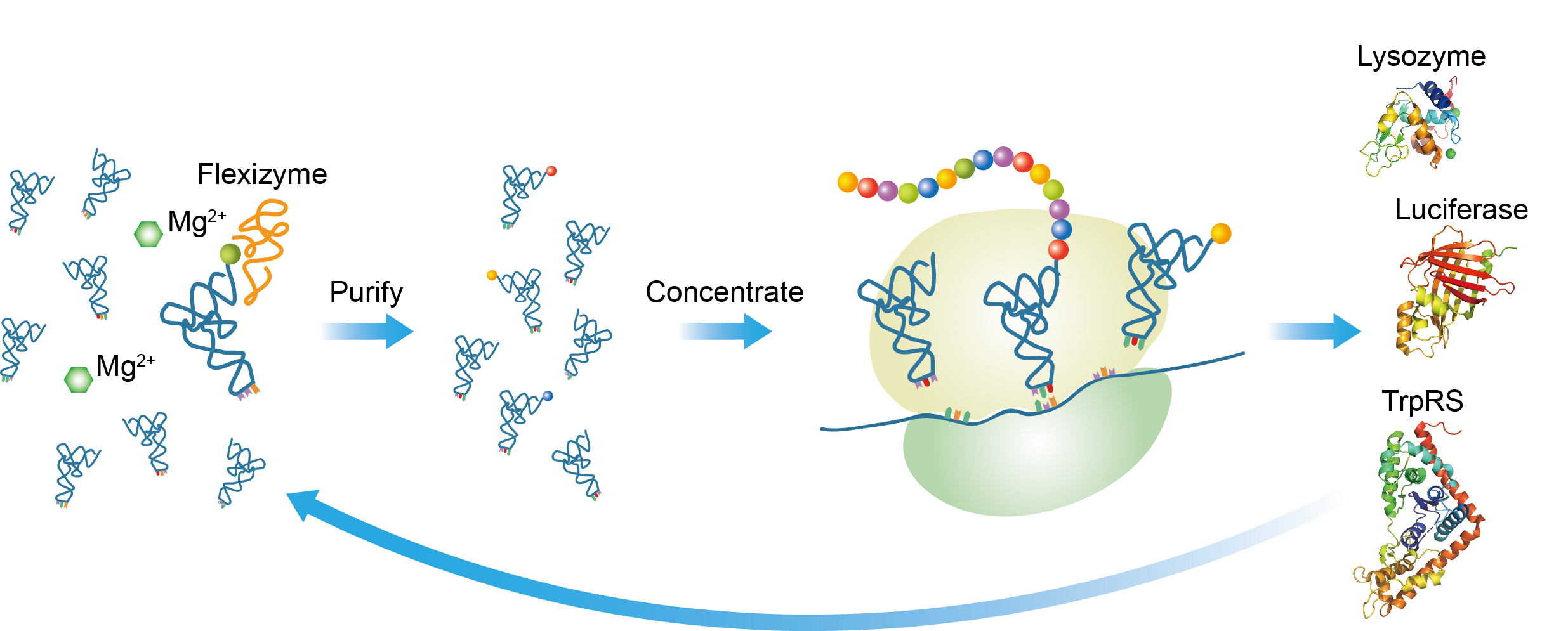 在该研究中,beat365英国官方网站生命学院朱听课题组在天然手性模型中对使用Flexizyme进行tRNA氨基酸装载的蛋白质翻译系统做了重新设计与优化,首次实现了不依赖氨酰tRNA合成酶的蛋白质翻译并得到多种具有活性的酶(图1)。值得一提的是,在没有氨酰tRNA合成酶的参与下,该系统翻译产生了具有活性的氨酰tRNA合成酶TrpRS,显示在生命起源过程中,类似具有tRNA氨基酸装载功能的核酶可能在蛋白质翻译系统的早期进化中发挥了重要作用。