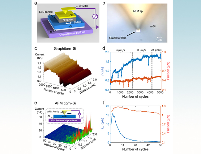 肖特基超滑发电机的结构、输出电流和摩擦力,及其与传统肖特基发电机的对比。(a)石墨岛/ n型硅形成的肖特基超滑发电机的结构示意图。(b)石墨岛/ n型硅形成的肖特基超滑发电机的光学显微镜图像。(c)肖特基超滑发电机的前2,000个循环的电流图。(d)肖特基超滑发电机在不同速度下的摩擦力(红色)和电流(蓝色)与滑动循环次数之间的关系。(e)纳米针尖与n型硅形成的传统肖特基发电机的前56个循环的电流图,以及结构示意图。(f)传统肖特基发电机的摩擦力(红色)和平均电流(蓝色)与滑动循环次数之间的关系。