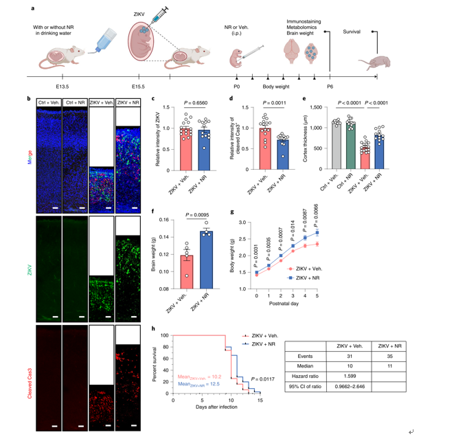 为了探究NAD+代谢重编程在ZIKV感染所致小头症中的功能,研究人员使用ZIKV感染小鼠所致小头症模型进行体内实验,观察回补NAD+及相关前体是否可以改善ZIKV感染所致的小头症。研究结果表明,脑注射NAD+可以显著抑制ZIKV感染所致的细胞凋亡,增加大脑皮层厚度。而腹腔注射NAD+的重要前体nicotinamide riboside(NR)不仅可以显著抑制ZIKV感染所致的细胞凋亡,增加大脑皮层厚度,还可以增加感染小鼠的体重和脑重,延长其生存期(图2)。