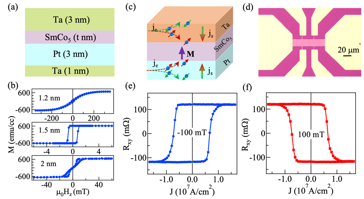 在广泛研究的重金属/铁磁膜中,自旋轨道力矩可以有效地操纵磁化强度,界面反演对称破缺同时也可以衍生出磁斯格明子。这些基础研究可以为未来自旋器件提供新思路,因而是当下的研究热点。尽管传统磁性材料自旋电子学已经取得了较大进展,探索具有优异性能的新材料体系一直是本领域的研究前沿。SmCo5是一种稀土永磁材料,它具有强磁各向异性,被用作为高密度记录介质。若将其应用在界面自旋电子器件,在提高自旋器件的热稳定性的同时,也能提高器件存储密度。