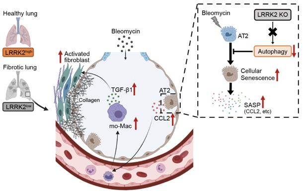 该研究首先发现在博来霉素诱导的肺纤维化小鼠以及特发性肺纤维化病人的肺组织中LRRK2的表达水平显著降低。进一步研究发现LRRK2缺陷型小鼠在博莱霉素诱导的肺纤维化疾病模型中发病和进展更快、肺纤维化更严重,肺组织伴有大量促纤维化型巨噬细胞和中性粒细胞浸润。随后,通过构建骨髓嵌合体小鼠模型发现LRRK2主要通过调控非造血来源细胞的功能在肺纤维化发病过程中发挥保护作用。对LRRK2在肺部各类细胞中表达谱分析发现,LRRK2主要表达于肺泡II型上皮(AT2)细胞,且在肺纤维化小鼠及特发性肺纤维化病人AT2细胞中显著下调。进一步分析发现LRRK2缺陷的AT2细胞在肺纤维化发病过程中功能严重受损,表现为自噬过程受阻及加速的细胞衰老表型。在肺纤维化进程中,LRRK2缺陷的AT2细胞通过产生更大量的细胞衰老相关分泌表型因子CCL2,显示出更强的依赖于CCL2/CCR2途径募集单核来源巨噬细胞的能力,加剧巨噬细胞介导的促纤维化应答,导致肺纤维化加重。综上所述,本研究首次揭示LRRK2通过维持AT2细胞功能并调控AT2与免疫细胞间的交互作用,在维持肺组织稳态及抑制肺纤维化发生中发挥重要调控作用。