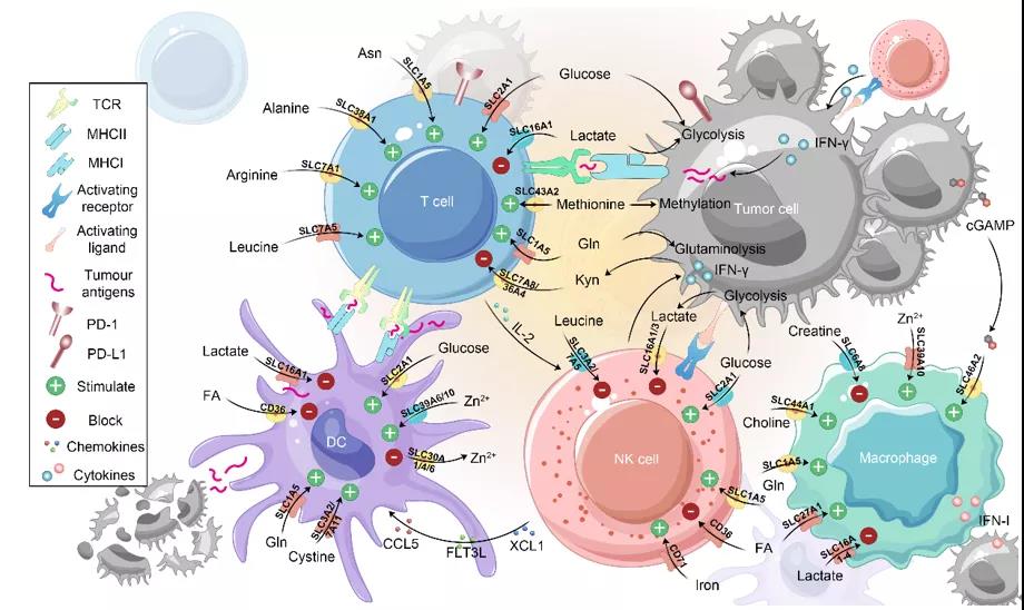 事实上,肿瘤微环境类似于淋巴器官,除肿瘤细胞外,还包含着各种类型的免疫细胞。无限增殖的肿瘤细胞和激活的免疫细胞都需要通过代谢重编程SLCs的表达来摄取足够的营养物质和维持内环境的稳态。近年来,越来越多的研究也表明SLCs在肿瘤免疫中发挥着重要的调控作用。2019年,陈立功课题组与医学院胡小玉课题组合作揭示SLC6A8转运蛋白介导肌酸调控巨噬细胞极化的新发现。2020年,邹伟平课题组发现肿瘤通过SLC43A2来竞争T细胞的甲硫氨酸,从而影响T细胞的甲硫氨酸代谢和组蛋白甲基化修饰。同年,该课题组还发表了氨基酸及其转运体在T细胞免疫和癌症治疗的研究综述。此外,SLC7A11和SLC16A1/4等转运蛋白也已经被证实可以促进肿瘤的发生发展。因此,SLCs无论对免疫细胞还是肿瘤细胞来说,都十分重要,且可能平衡是肿瘤免疫治疗的一个重要支点。系统地总结三大营养物质(葡萄糖、氨基酸和脂质)相关的SLCs对不同免疫细胞的影响,可以引导我们更好地操控免疫代谢来增强肿瘤免疫治疗。