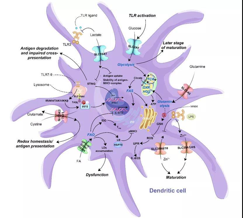 类似地,在DC细胞(图2)、NK细胞和巨噬细胞中,不同的SLCs也通过其转运的底物或者本身作为某一功能模块影响着免疫细胞多种生物学过程和事件。本综述通过分析和总结,系统地浮现了最新有关SLCs在这些免疫细胞中的深层调控规律,并试图利用这些发现通过联合靶向多种免疫细胞上具有潜力的SLCs来增强整体抗肿瘤免疫反应,最终为现有的免疫疗法或设计下一代免疫疗法提供一些新的思路。