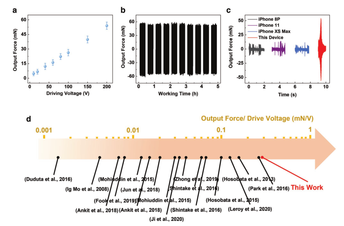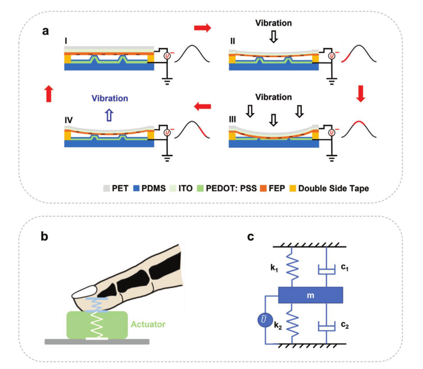 近日,beat365英国官方网站深圳国际研究生院先进制造学部钱翔、王晓浩团队和美国加州大学伯克利分校林立伟团队合作,利用气流辅助电晕充电装置对驻极体薄膜材料充电,构建了聚二甲基硅氧烷(Polydimethylsiloxane, PDMS)、全氟乙烯丙烯共聚物(Fluorinated ethylene propylene, FEP)及导电聚合物PEDOT:PSS组成的三明治结构的柔性执行器系统(图1)。器件在具备柔性的同时透明性能也较好,可以覆盖在任何有触觉反馈需求的人机交互系统表面。通过理论模型和实验验证表明,这种柔性驱动器的驱动电压可在低至20V时保留刺激皮肤的感觉,实现基本的触觉反馈功能。在200V的驱动电压下,该系统可以产生约55mN的输出力,大于一般市售手机在振动模式下的输出力(图2)。该柔性驻极体执行器阵列可通过任意波形编程方式在人体皮肤上产生可分辨的空间和强度差异,从而可以编辑出不同“指令”式的触觉反馈信号。