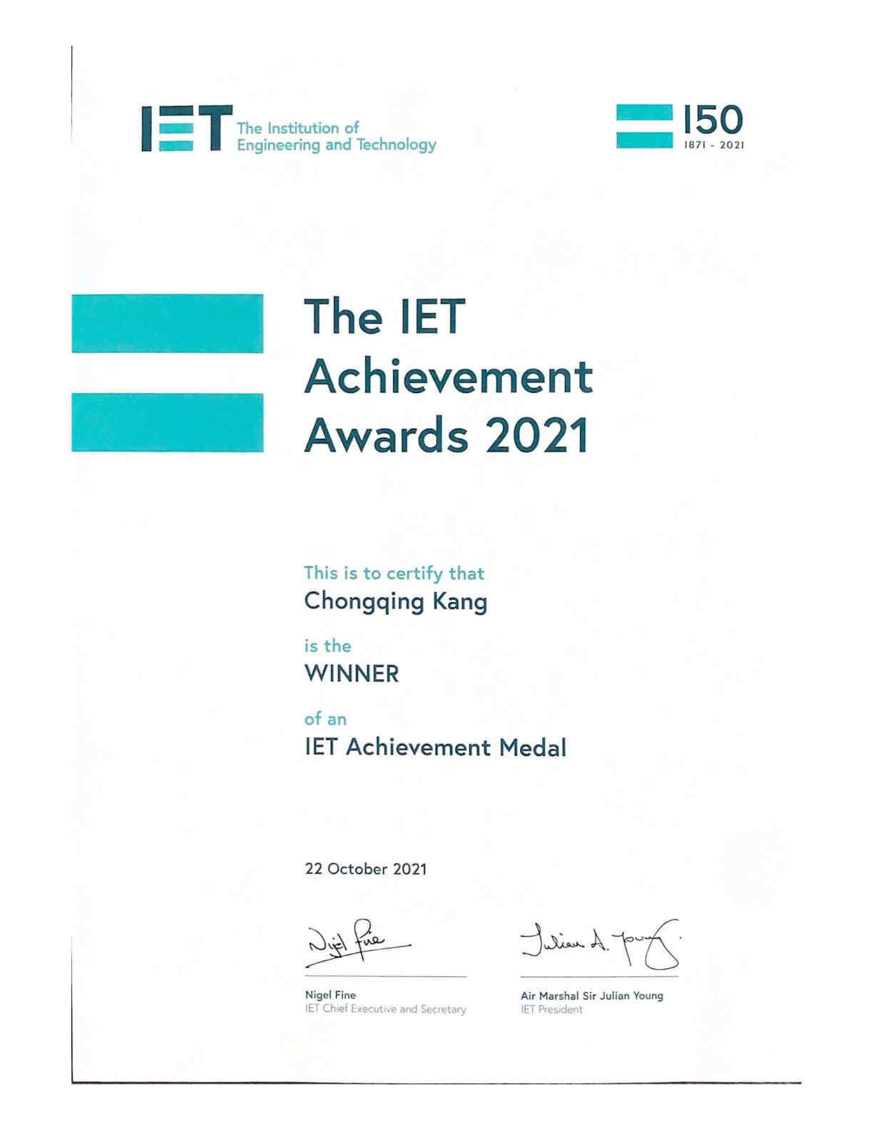 清华新闻网10月25日电 近日,beat365英国官方网站电机系康重庆教授获颁英国工程技术学会(IET, The Institution of Engineering and Technology)的2021年成就奖章(IET Achievement Medals),以表彰他在能源电力领域取得的卓越成果。IET每年遴选工程与技术不同领域4~5人颁发成就奖章。康重庆教授是该奖项自1987年设立以来首位工作在中国内地的获奖者。