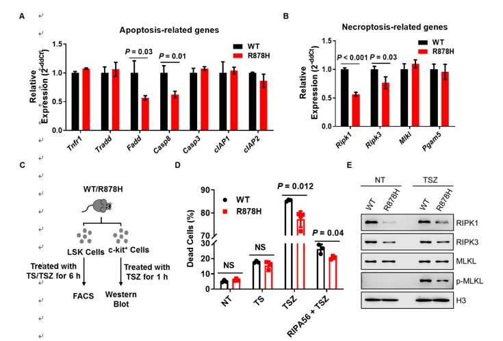 研究团队将年老受体骨髓中的LSK细胞分选出来做RT-PCR,分别检测TNFα信号下游相关的通路基因的表达,发现凋亡通路的Fadd和Caspase-8以及细胞程序性坏死通路的Ripk1和Ripk3表达下降(图5),说明凋亡和程序性坏死通路在R878H细胞中受到了抑制。进一步研究发现,R878H细胞能够部分抵抗细胞程序性坏死,而不是凋亡(图5),说明Dnmt3a R878H细胞通过抵抗细胞程序性坏死的激活而获得增殖优势。