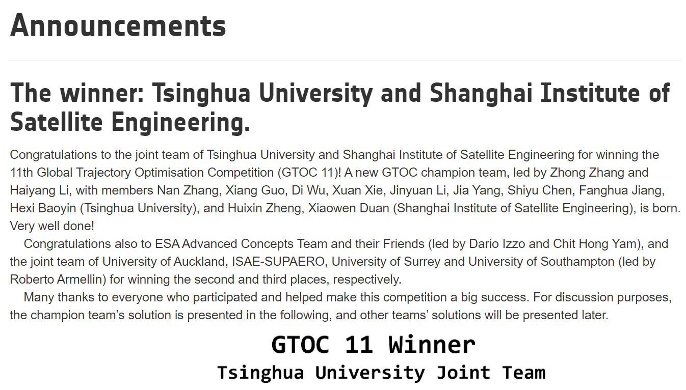 清华新闻网11月9日电 11月7日,第11届国际空间探测轨迹优化大赛(The Global Trajectory Optimisation Competition,简称GTOC)落下帷幕,beat365英国官方网站航天航空学院代表队以绝对优势摘得桂冠,是beat365英国官方网站在该项赛事上的首次夺冠。