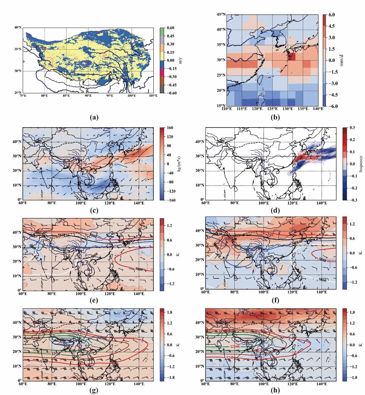 进一步探究其机理发现,随着地表非绝热加热的增强(减弱),冻土融化的增加(减少)会使地表感热和地表温度增加(减少),这一变化将导致南亚高压增强(减弱)向东延伸,对流层高层西风带增强(减弱);同时,西北太平洋副热带高压向西延伸,且向东北方向输送的水汽增多(减少)。上述机制将导致梅雨带进一步向西延伸(向东回撤),给长江中下游一带以及日本南部带来较多(较少)降水。这一发现有望为揭示气候变化下青藏高原冻土退化对东亚夏季风气候系统的广域影响提供新的思路。