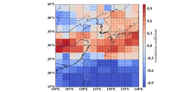 图2 1981-2019年夏前冻土融化和东亚降雨之间的耦合分析。第一个MCA模式(协方差frac=59%, corr=0.99)下的(a)夏前冻土融化和(b)东亚6、7月降水的异质性回归图。黑色标记表示具有统计学显著相关性的区域(p<0.1)